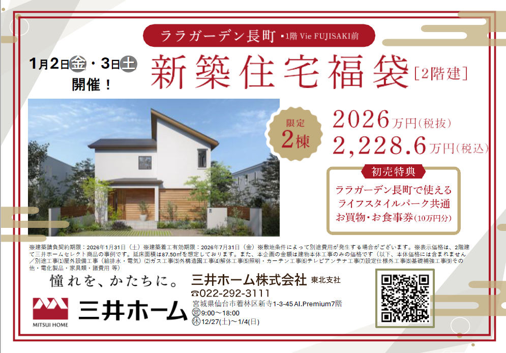 三井ホームより、限定2棟で住宅本体価格2,026万円(税込 22,286,000円)の住宅福袋を販売いたします。