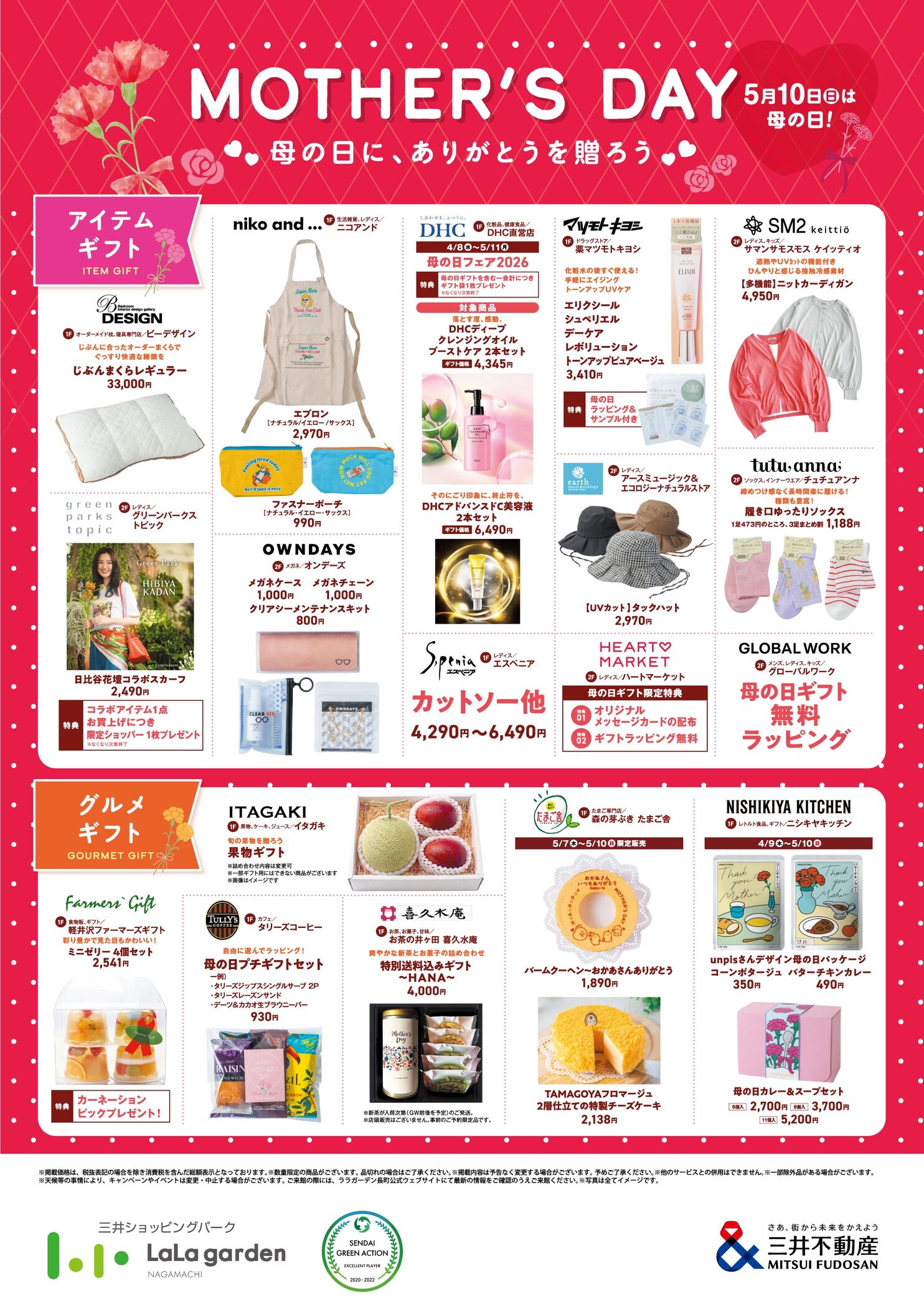 ララガーデン長町では各店で「母の日ギフト」をご用意しております。限定商品や特典サービスも!