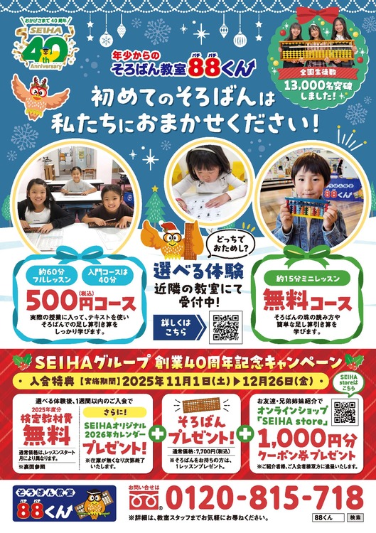 - (セイハ英語学院)10:00~19:00 (そろばん教室88くん)平日14:00~19:30/土日祝日10:00~19:00