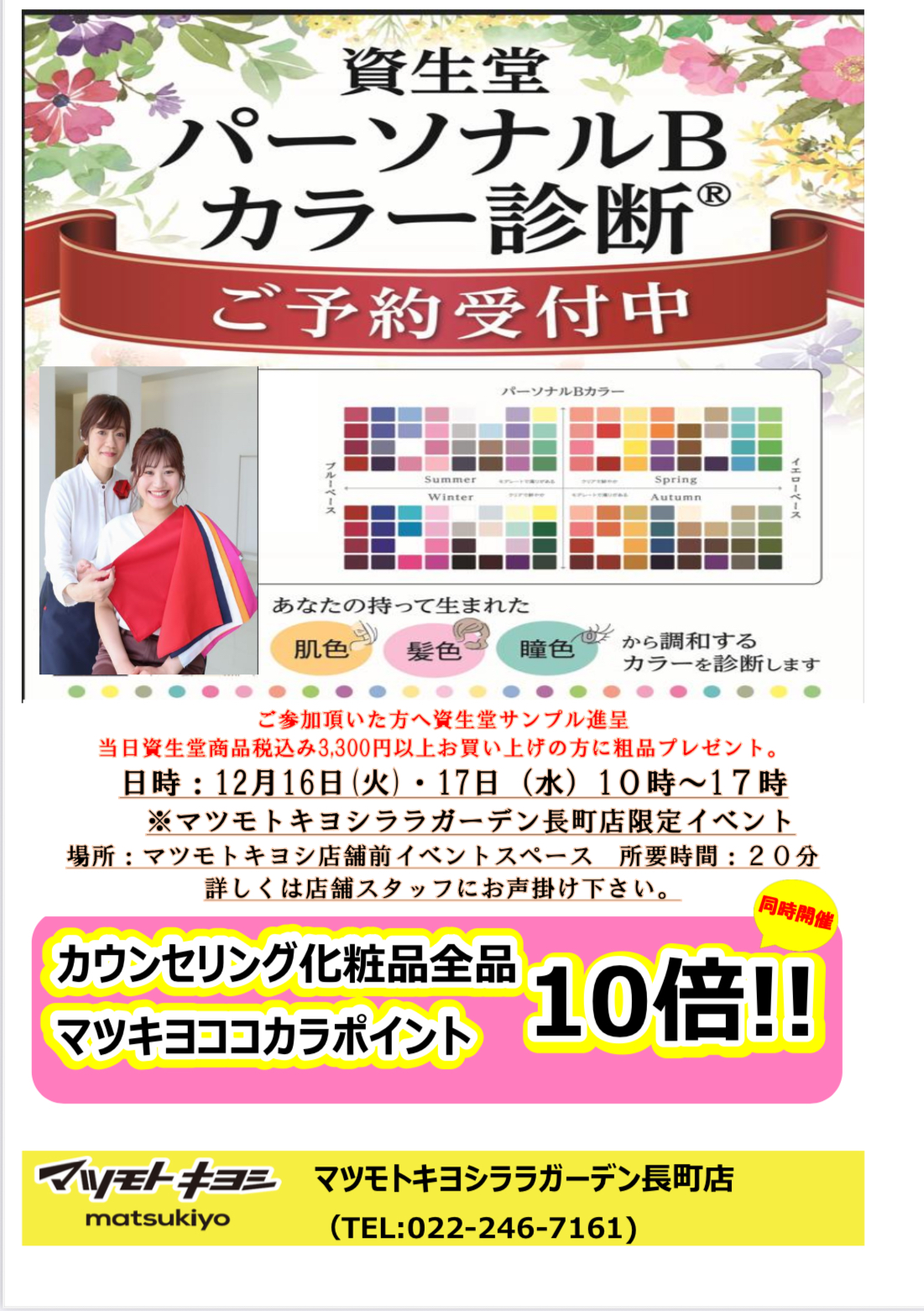 12月16日(火)、12月17日(水)に資生堂パーソナルビューティーカラー診断イベントを開催いたします!!