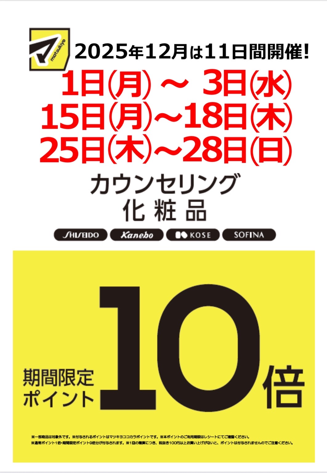 カウンセリング化粧品ご購入時にマツキヨココカラポイントカードご掲示で、マツキヨポイントが10倍付与となっております!!