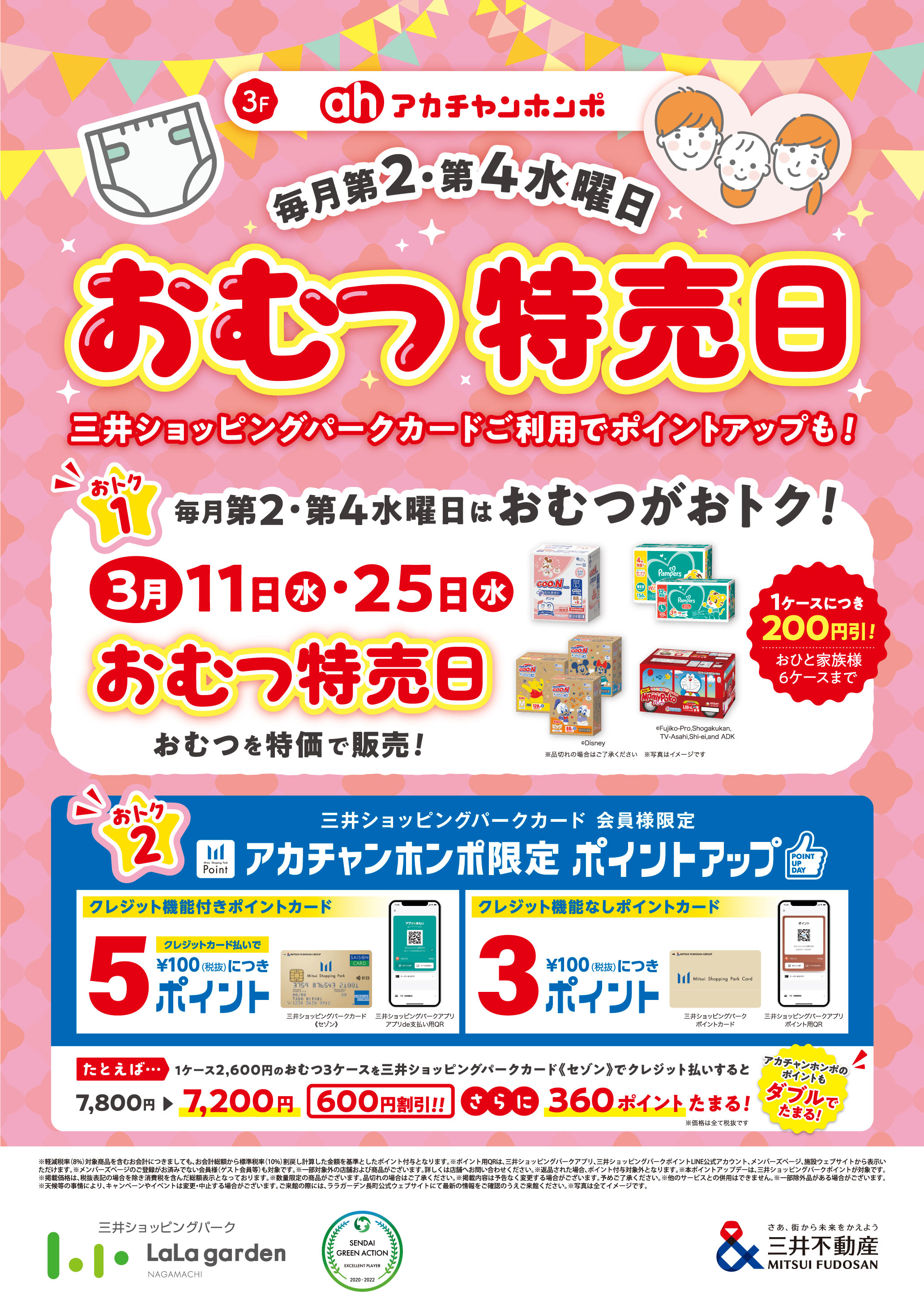 ☆ララガーデン長町店限定企画☆ 毎月第2・第4水曜日は「おむつ特売日」!
