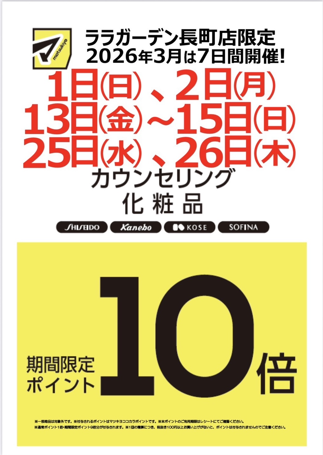 カウンセリング化粧品ご購入時にマツキヨココカラポイントカードご掲示で、マツキヨポイントが10倍付与となっております!!