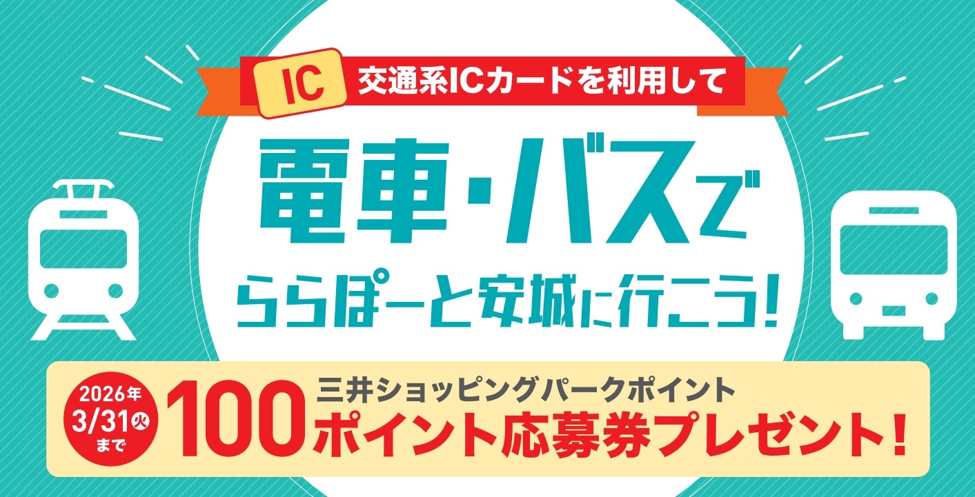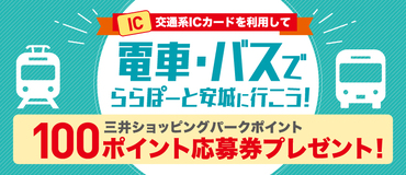 公共交通機関で来館して、館内に設置してあるIC端末機へ交通系ICカードをタッチいただくと、10回のご利用で三井ショッピングパークポイント100ポイントがもらえる応募券をプレゼント!