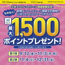 - 【三井アウトレットパーク 岡崎開業記念】新規メンバーズページ登録&お買物で最大1,500ポイントプレゼント!