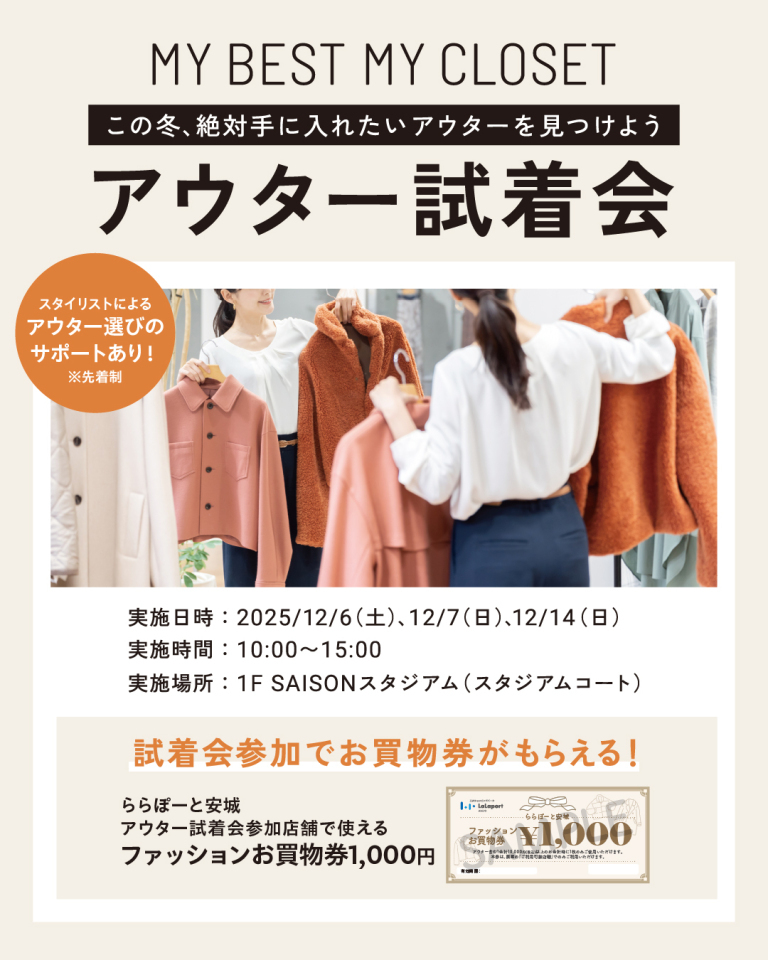 さらに、試着会参加者限定でアウター購入時にご利用可能な1,000円分のお買物券もプレゼント!