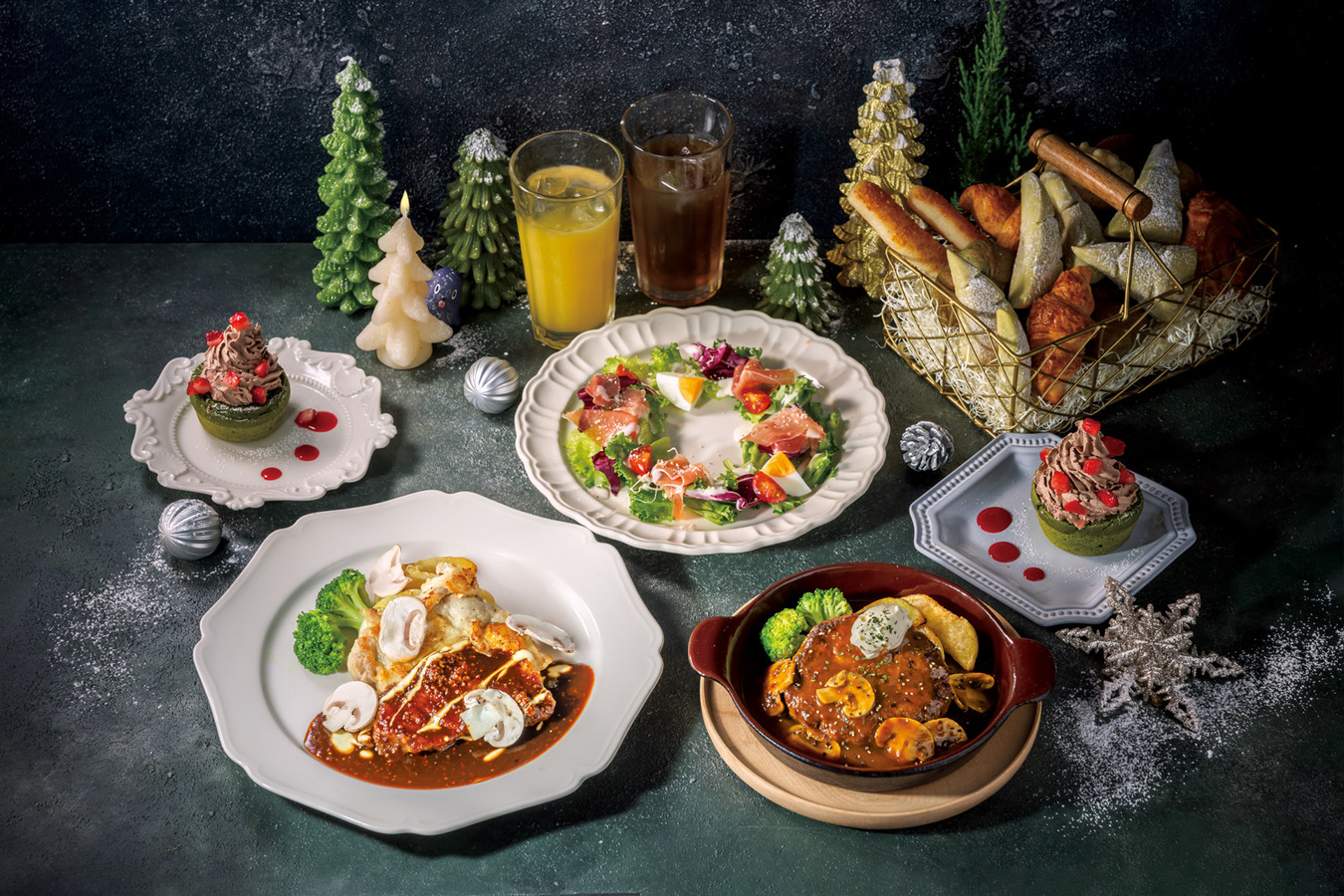 前菜リースサラダ・メイン主菜2品・パン食べ放題ドリンクバーデザート2名様分