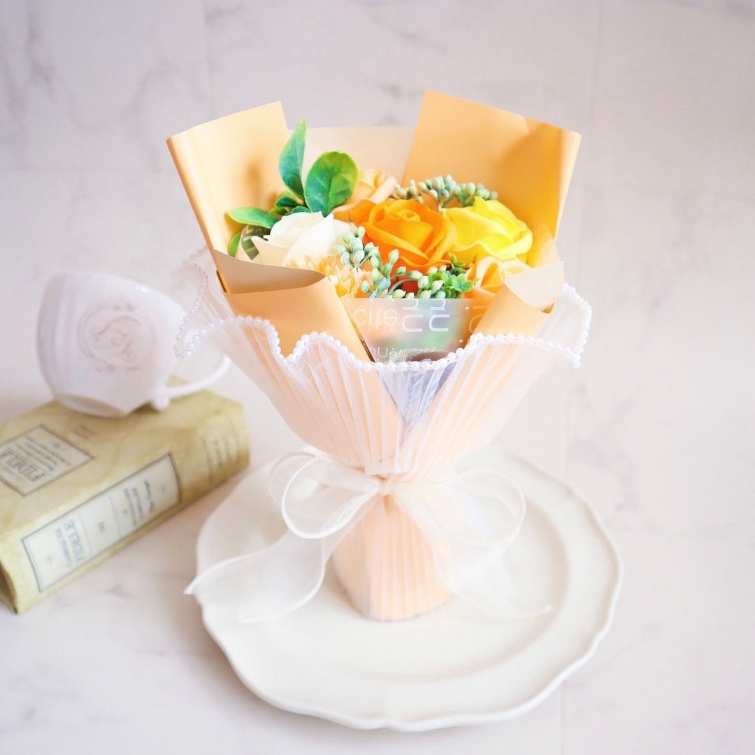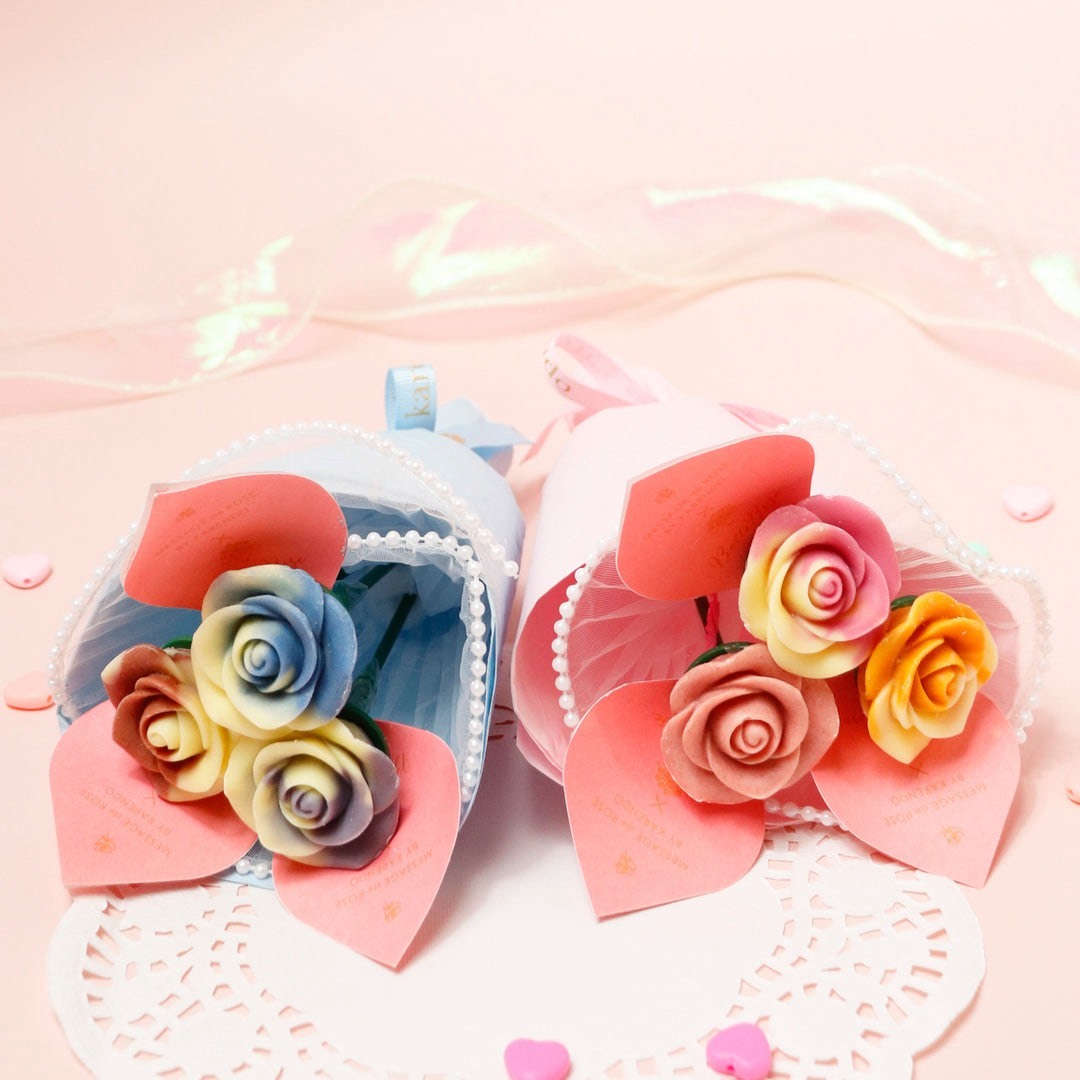 - 生花おまかせ花束 ¥3500+税 / ソープフラワー emi オーガンジーパールブーケ ¥3600+税 / チョコレート ベルローズ3本ブーケ ¥1786+税