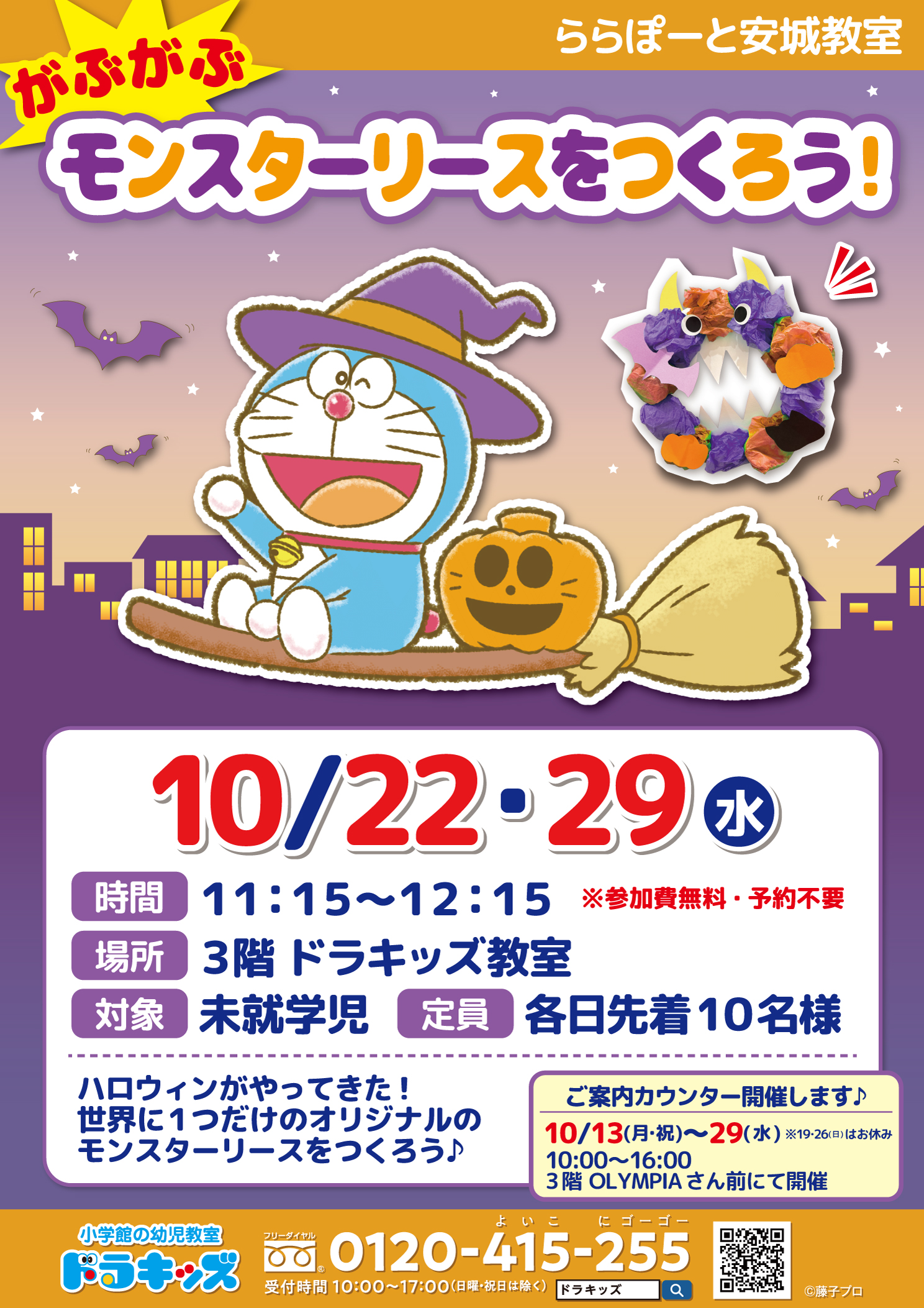 もうすぐハロウィン♪お家に飾ることができるリースを作りませんか?小さなお子さまでもおうちの方と楽しんで作ることのできるハロウィンリースです。教室は3階にあります、どこでもドアを開けてお待ちしています♪