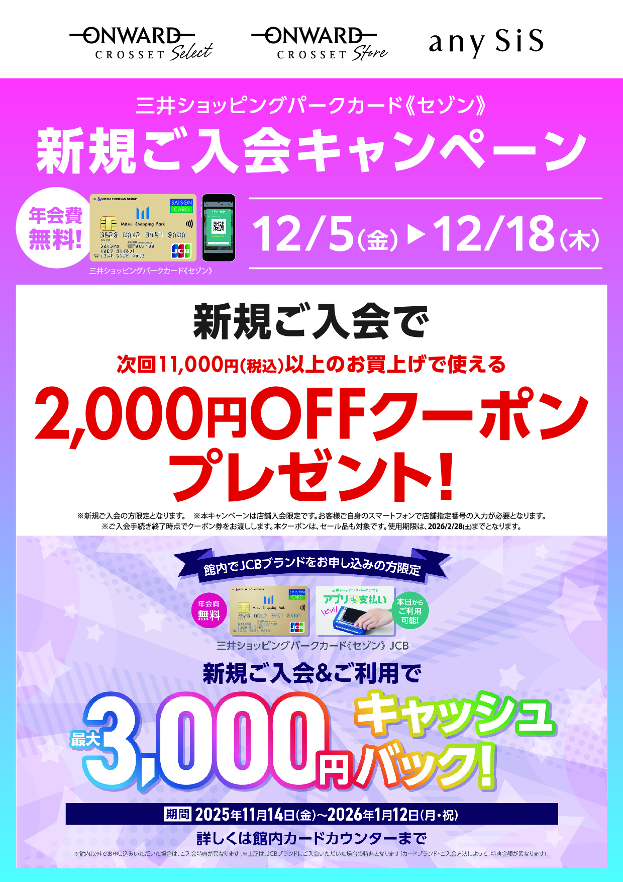 12/5(金)~12/18(木)の期間中、「ONWARD CROSSET SELECT」にて、三井ショッピングパークカード《セゾン》に新規ご入会されたお客様へ、次回11,000円(税込)以上のお買上げで使える2,000円OFFクーポンをプレゼントします。