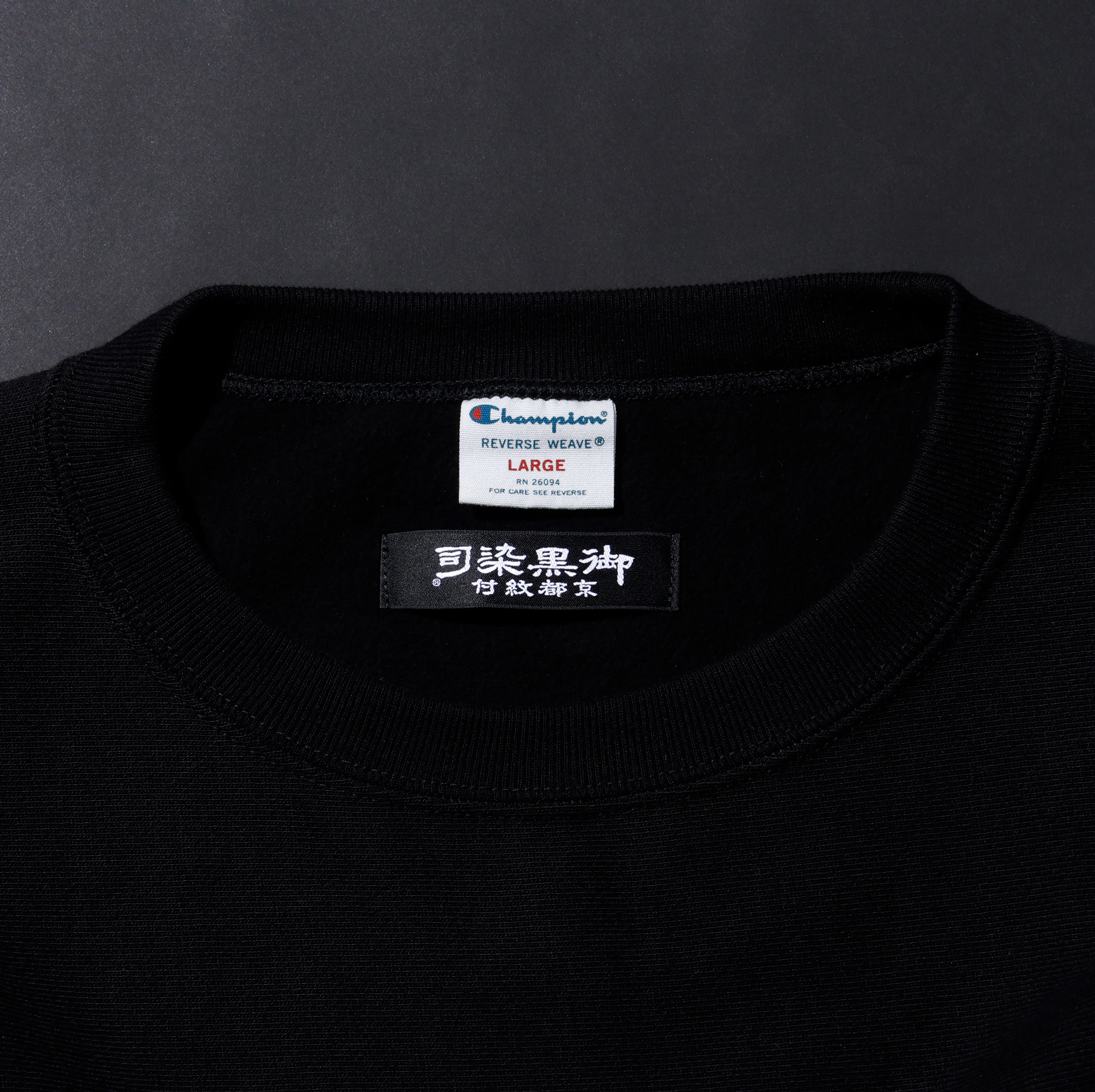 日本の伝統的な正装である黒紋付の「黒染」だけを、100年以上にわたり追求してきた京都紋付による「深黒(しんくろ)加工」を施した直営店限定アイテムが、チャンピオンを代表する製法「REVERSE WEAVE®(リバースウィーブ®)」の“三者混”と呼ばれるコットン・レーヨン・ポリエステルの混紡糸を使用した「REVERSE WEAVE® Tri Blend French Terry(リバースウィーブ® トライブレンドフレンチテリー)」から登場。