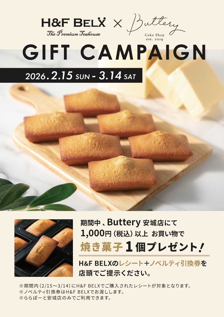 H&F BELXの期間内レシート+ノベルティー引換券をButtery安城店店頭でご提示ください。