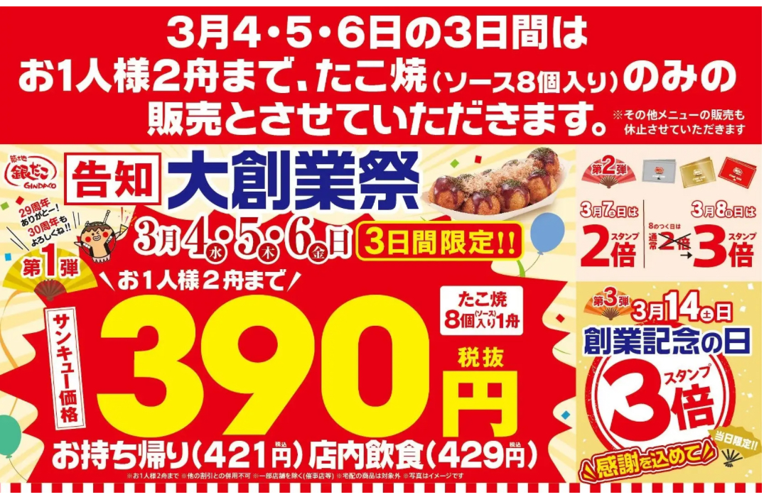 - 年に一度の大創業祭開催!感謝を込めた サンキュー価格(税抜390円)でご提供!銀だこ『大創業祭』3/4(水)より開催!