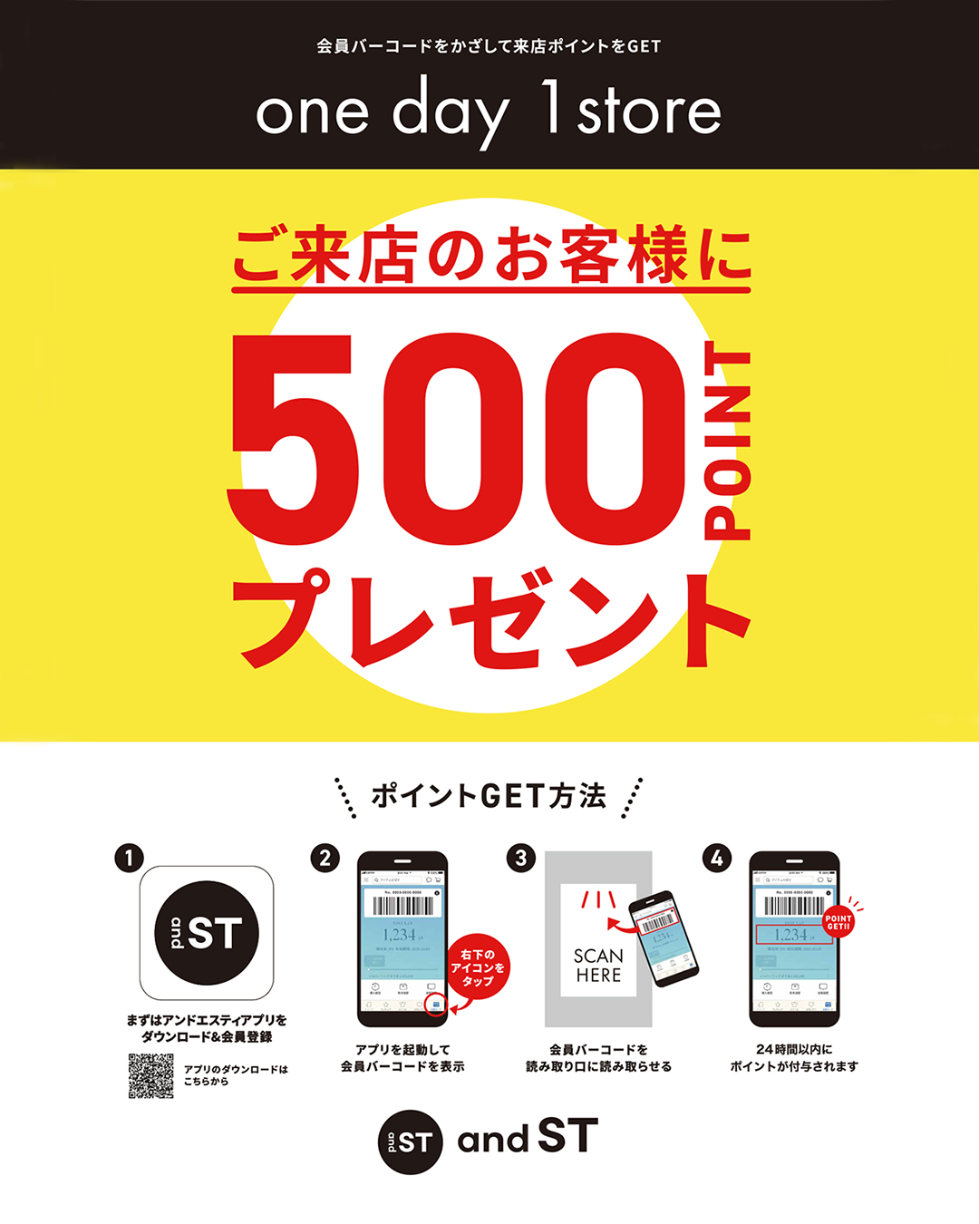 andST会員証バーコードをかざしていただくと毎日"500pt"プレゼントいたします。