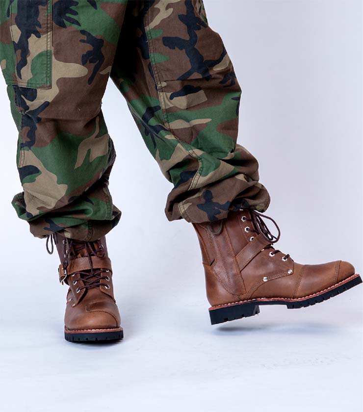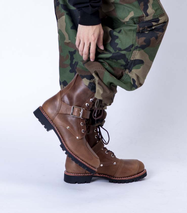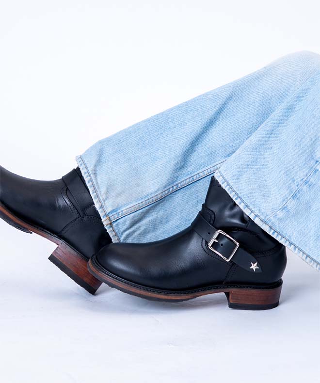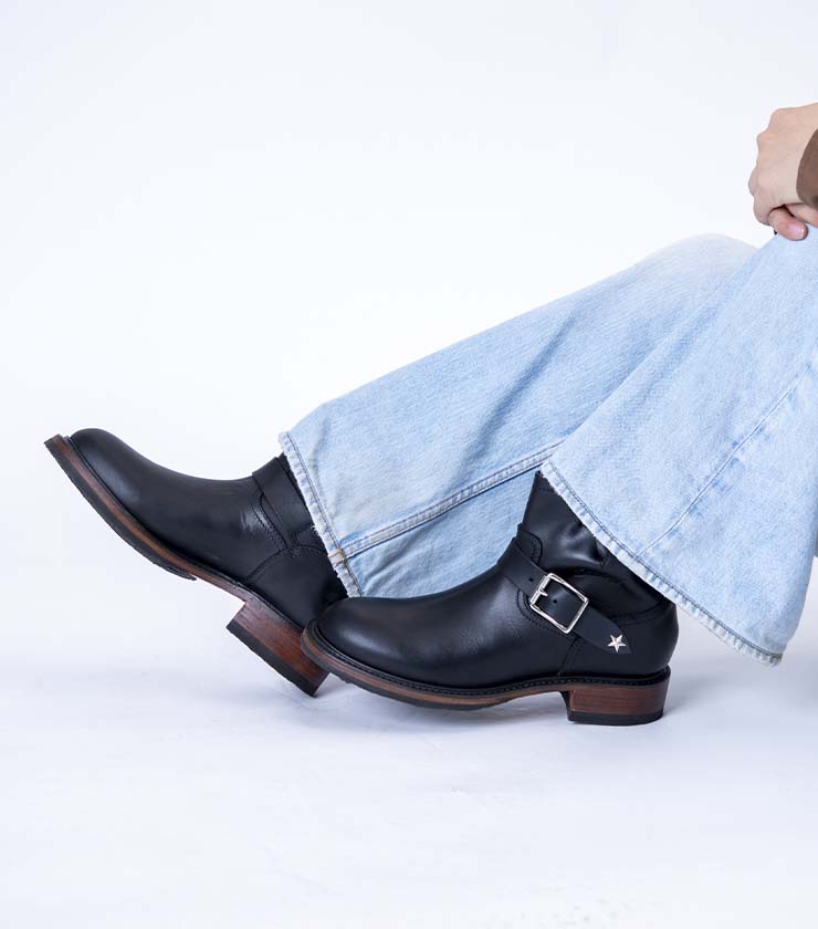 ウォータープルーフプルアップレザーで、天気を気にせずいつでも着用できるのがうれしい。トラディショナルなフォルムでどんなスタイルにも合わせやすい一足です。履きこむごとに馴染み、味が出てくる“育てたくなるブーツ”です。ベルトに入った星型のスタッズもポイント。