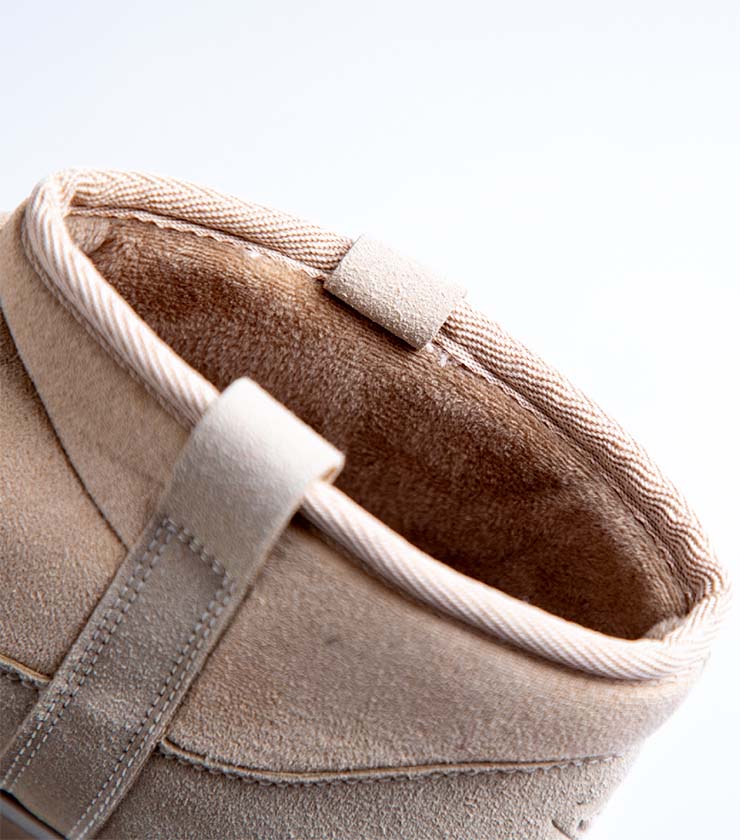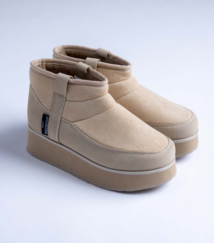 人気の厚底ブーツシリーズに、待望のスーパーショート丈が仲間入り。同系色の2種類のビーガンスエードを組み合わせ、ワントーンながら奥行きのある表情に仕上げました。撥水加工と防水仕様、クッション性の高いインソールで快適な履き心地を実現。秋冬のどんなスタイルにもなじみます。
