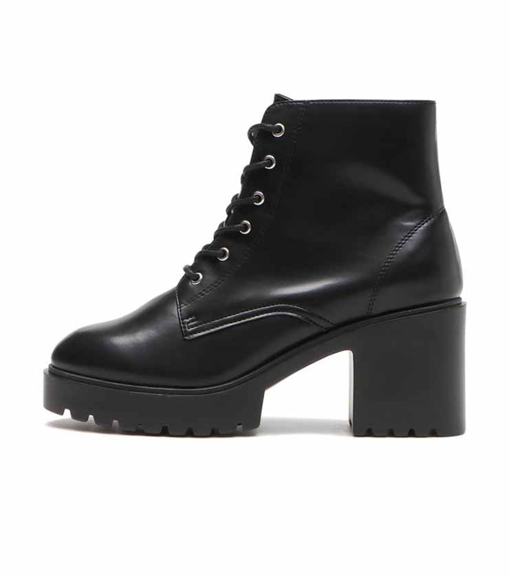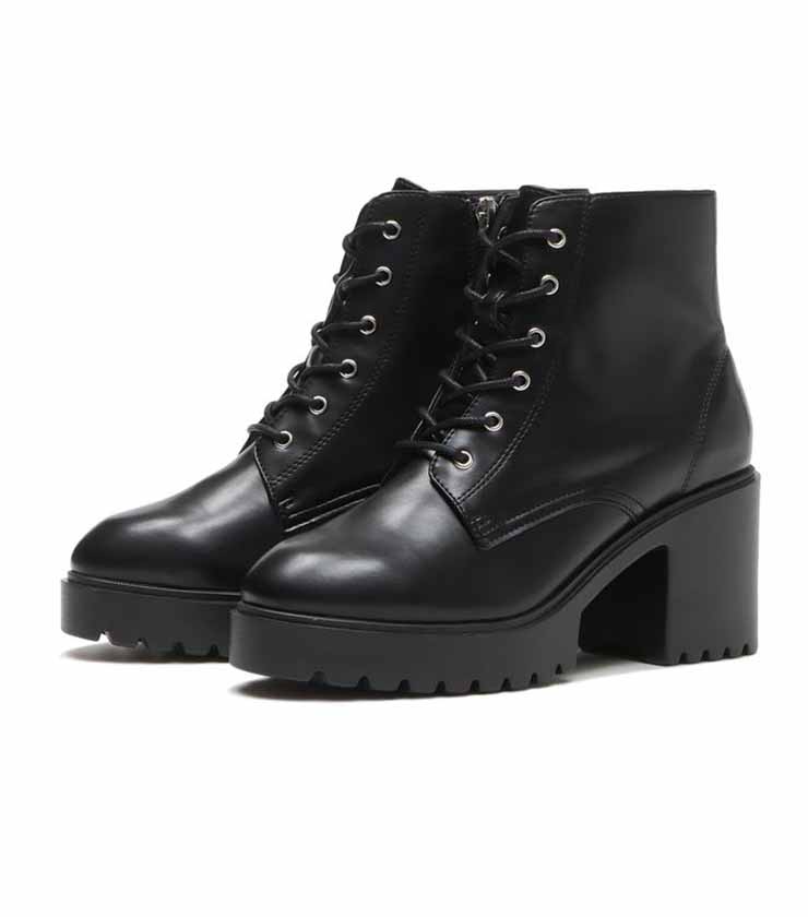 存在感のある凹凸ソールが印象的なレースアップブーツ。太めの丸紐が程よくボリュームを添え、足元にトレンド感をプラスします。タイトな筒まわりで脚をすっきり見せ、ミニ丈とも好相性。内側の金具付きファスナーが上品なアクセントになり、都会的な着こなしを引き締めます。