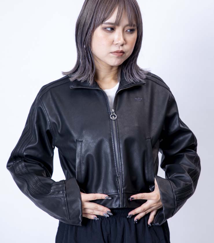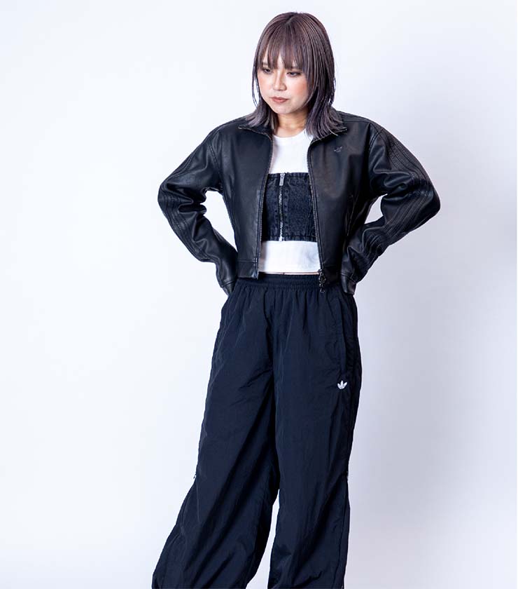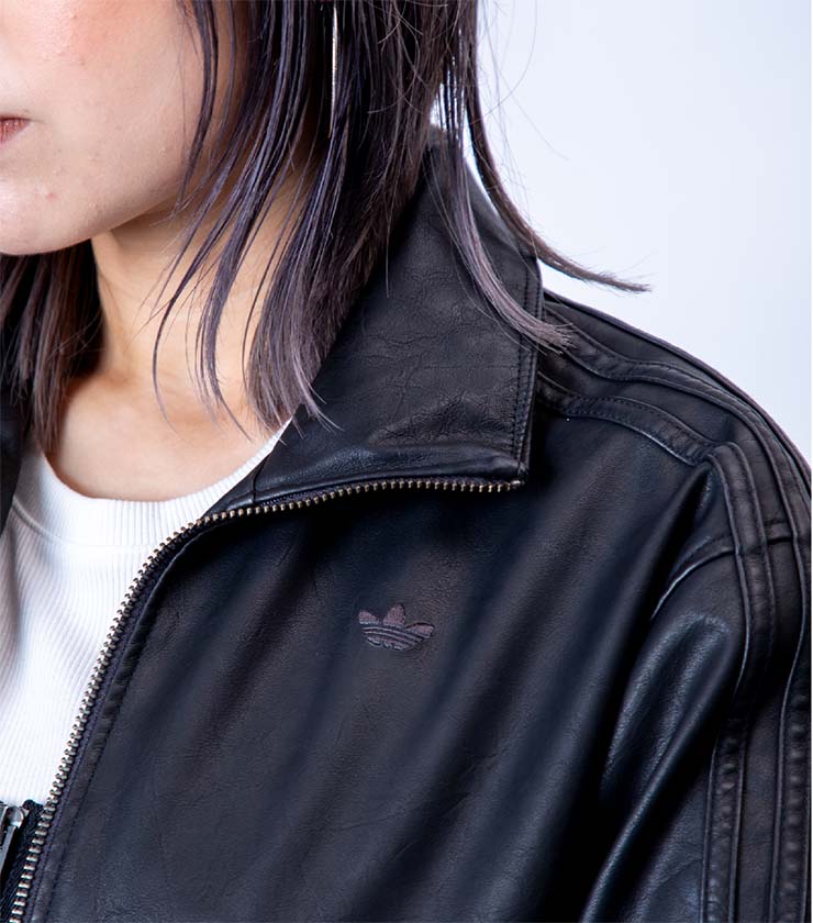 全体に施されたシワ加工が印象的なフェイクレザージャケットは、コンパクトなサイズ感が今年らしい一枚です。〈adidas〉のシグニチャーであるスリーストライプを袖にあしらったひねりの効いたデザイン。合わせ次第でハードにもクラシカルにも着用できます。