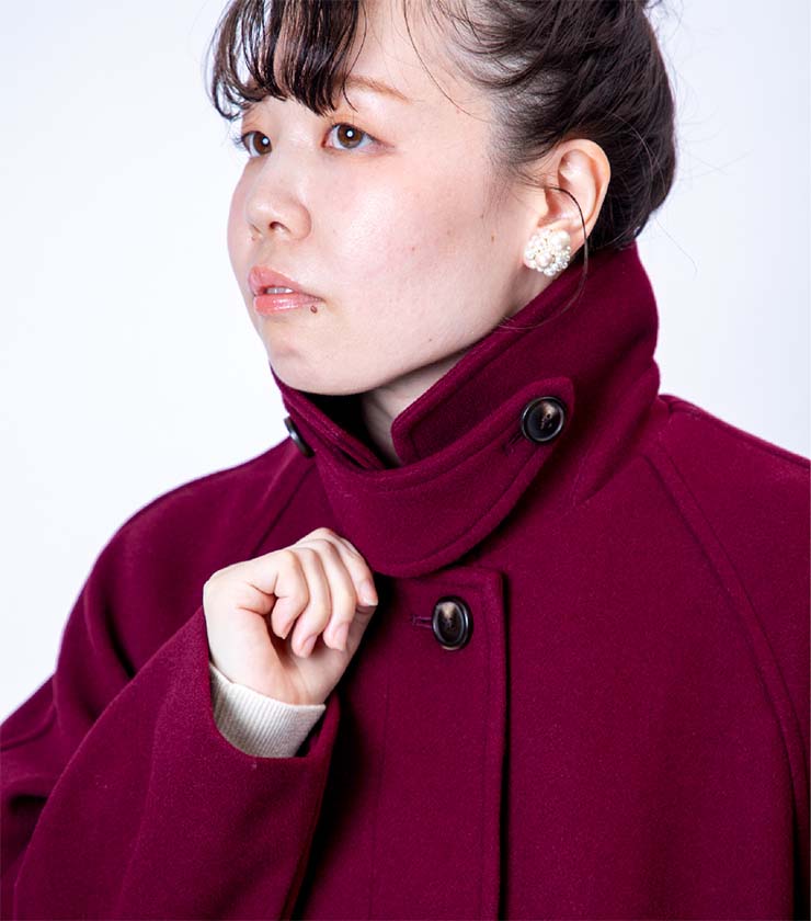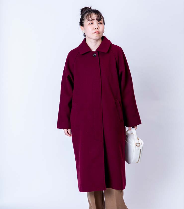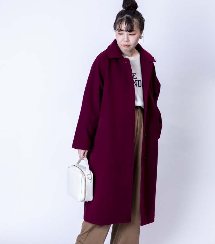 ウールライク素材で上品に仕立てたロングコートです。スタンドカラーにもなるスロートラッチ付きで防寒性を高めつつ、すっきりとしたシルエットで大人の落ち着きを演出します。深みのあるボルドーカラーが冬の装いに華やぎを添えます。