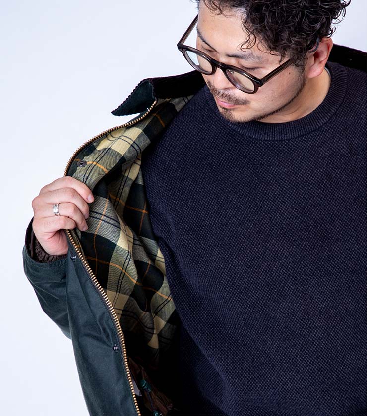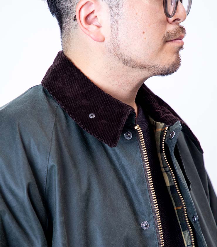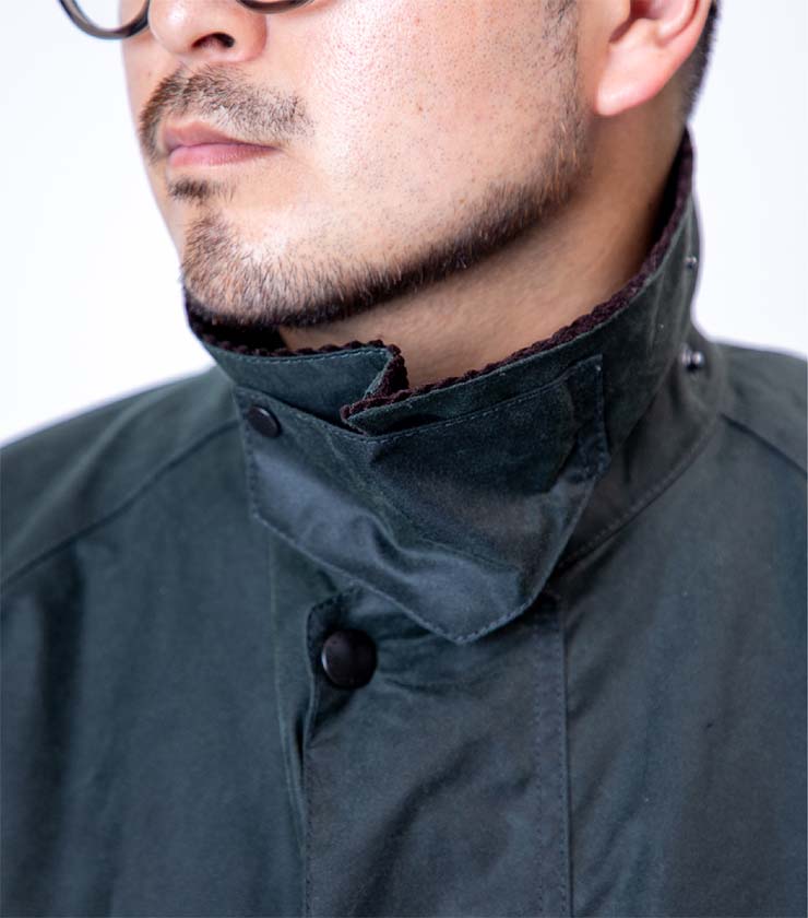 伝統のワックスドコットンを使用したショートジャケット。襟元には上品なコーデュロイをあしらい、クラシックな印象に仕上げました。コンパクトな着丈ながら、ワイドなシルエットでリラックス感のある着心地です。耐風性と撥水性を備え、長く愛用したくなる一着です。