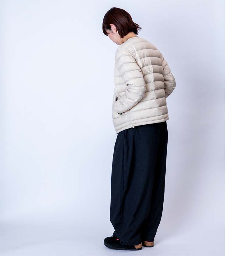 リサイクルダウンを使用した、環境に優しいノーカラーのダウンです。高密度に織り上げたナイロンタフタが程よいハリ感とマットな質感を生み出し、上品な印象に。ウエストのスピンドルでシルエット調整ができ、アウトドアから街まで活躍します。