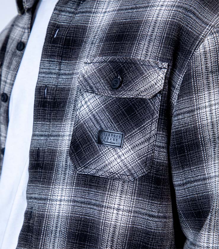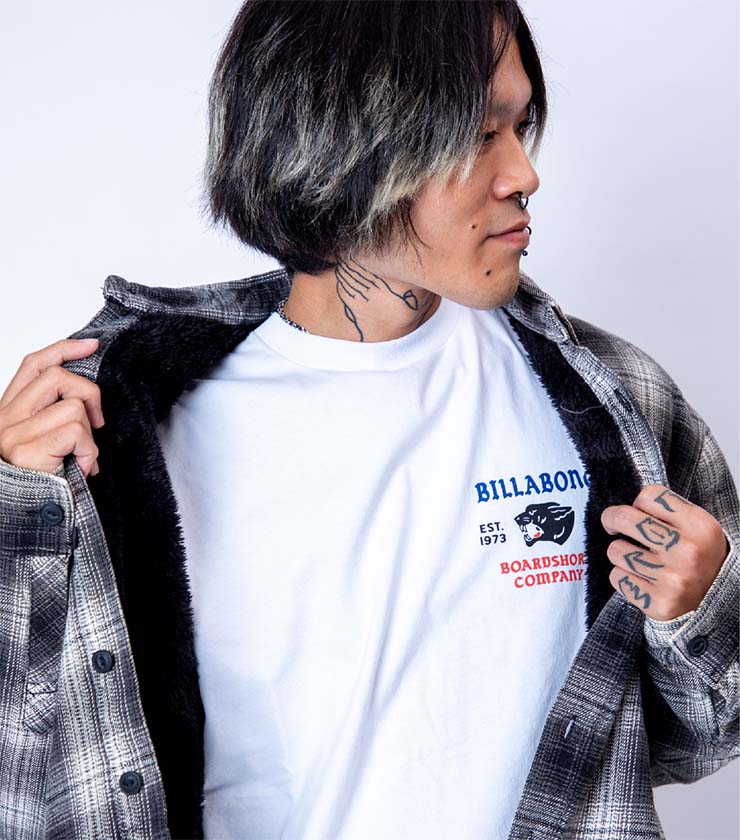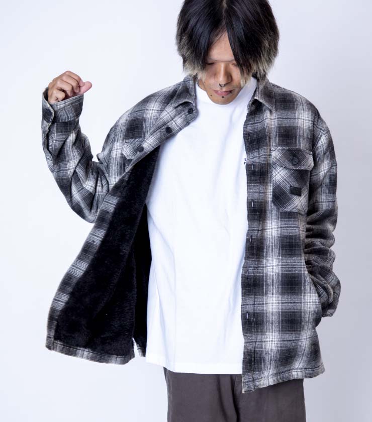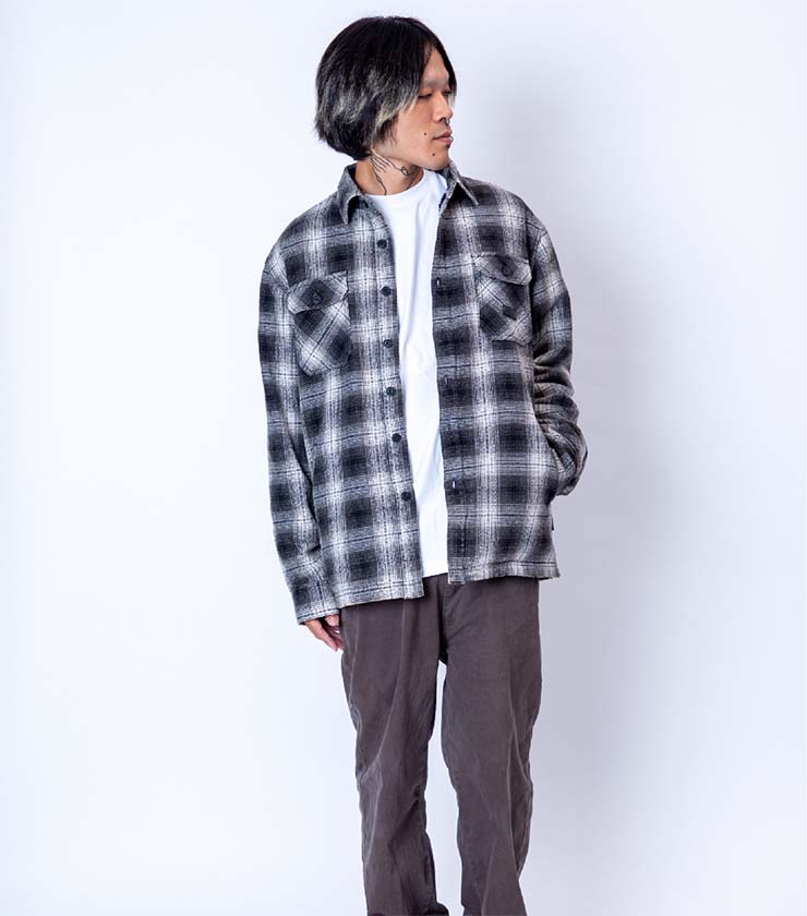 ウォッシュ感のあるオンブレチェックのシャツは、サラッと一枚羽織るだけでスタイリングが決まる秀逸アイテム。一見普通のシャツですが、裏地がボアフリースになっていて、想像以上に暖かく真冬でも着られます。左胸のPUレザーパッチもアクセントになっています。