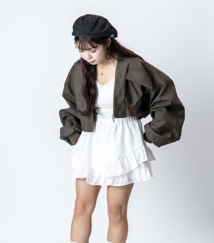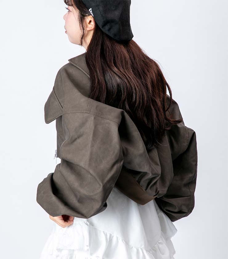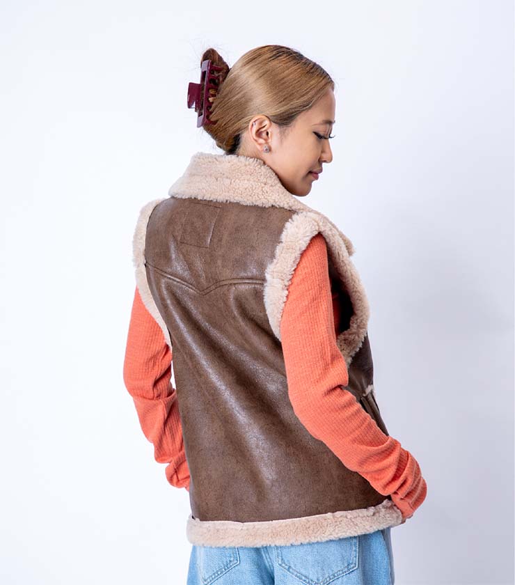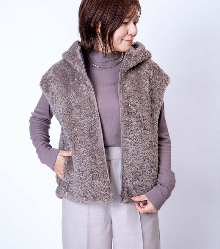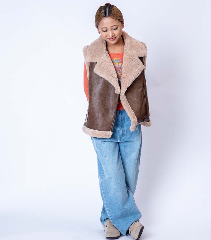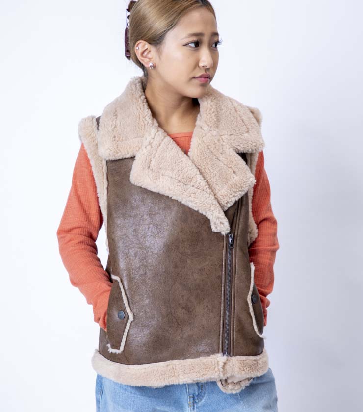 フェイクレザーとボアをボンディングした、表情豊かなベストジャケット。ボリュームがありながらも、サイズ感がコンパクトなのがうれしいです。ライダースから着想を得たフロントのデザインが個性的な一枚で、シンプルスタイルに合わせるだけで一気に旬なコーディネートに仕上がります。