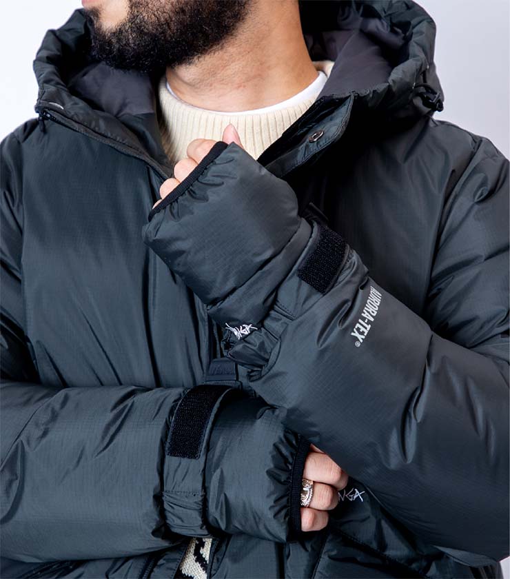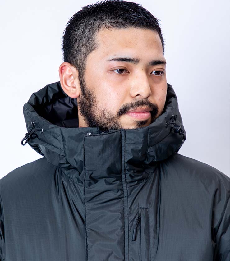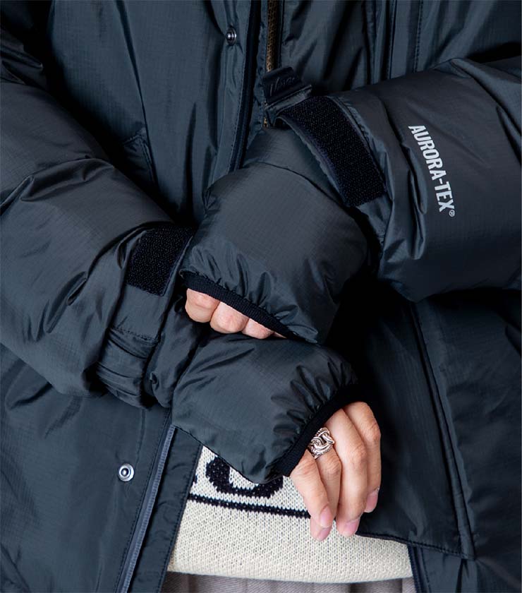 撥水・防水透湿素材「AURORA-TEX(R)」を採用した、高機能ダウンジャケット。軽量ながら700FPのエシカルダウンを贅沢に充填し、抜群の保温性を発揮します。また、内側にはC6撥水ナイロンタフタを使用し、耐久性と快適性を両立します。ハンドウォーマー付きで真冬のおでかけを快適にサポートします。