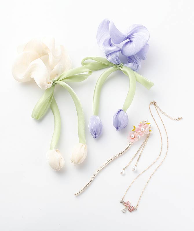 チューリップシュシュ(ホワイト/パール) 550円、桜ネックレス/キュービックジルコニア 990円、桜かんざし 550円