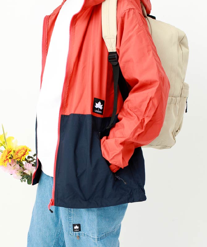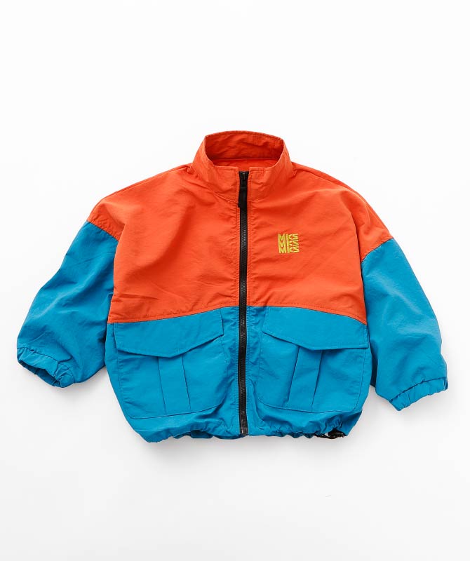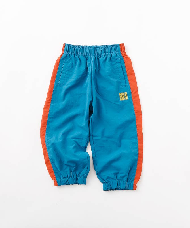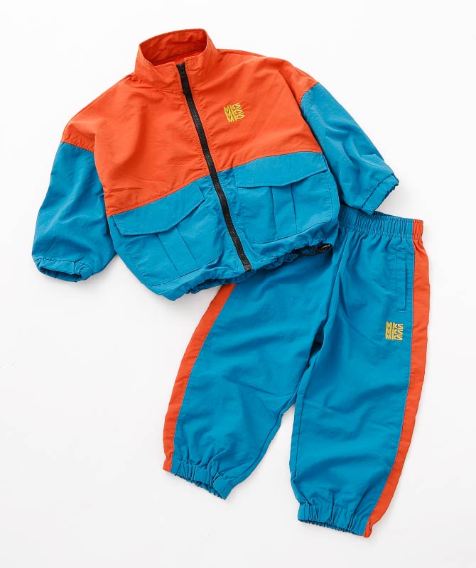 カラーブロックデザインが目を引くジャケットとラインパンツを合わせたアクティブスタイル。軽く羽織れるナイロン素材のジャケットは、ビッグポケット付きで実用性も抜群。総ゴム仕様のパンツは動きやすく、外遊びや通園通学にも安心です。