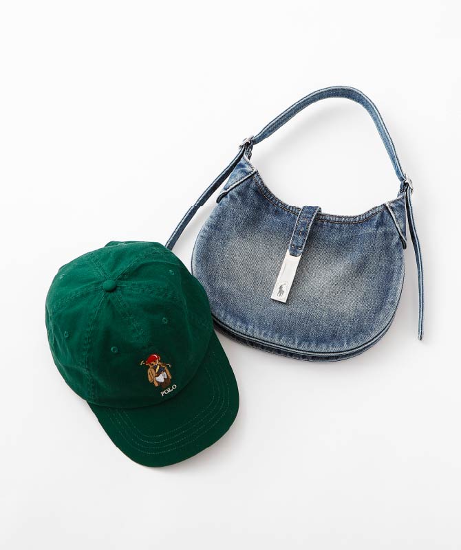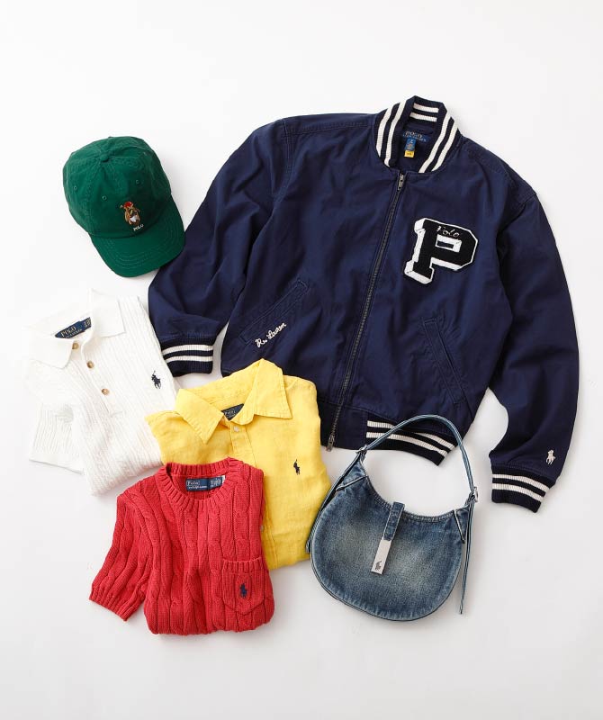 様々なスタイリングを楽しめるシーズンに春の新作が勢揃い。存在感のあるスタジャンは、右胸のデザインが目立つ主役になる一着。ケーブルニットとシャツは王道の上品さを表現します。デニムバッグとポロベアキャップは程よい遊び心を添え、こなれた春コーデに仕上がります。