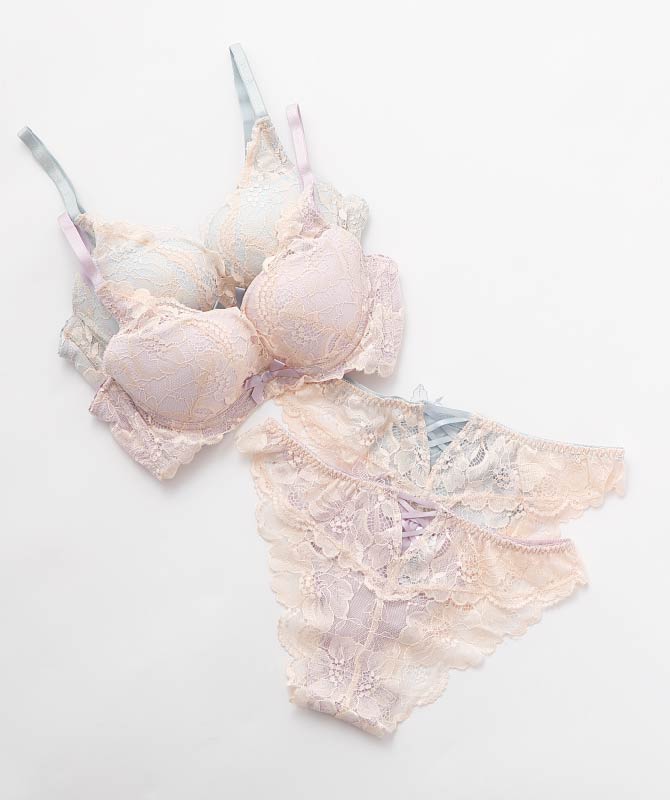 カシュクールレース脇高ブラ 3,190円、ショーツ(プレーン) 990円、ショーツ(ハーフ) 1,650円