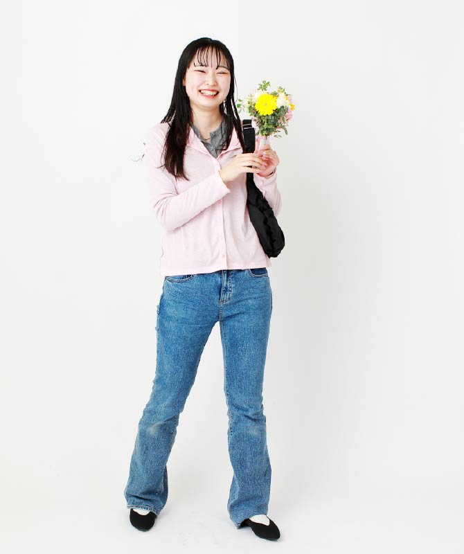ソフトシアーカーディガン 1,490円、スリムフレアジーンズ 2,990円、ウォッシャブルニットフラットシューズ 1,990円、ライトチェーンネックレス 590円、ダンプリングバッグ 1,990円