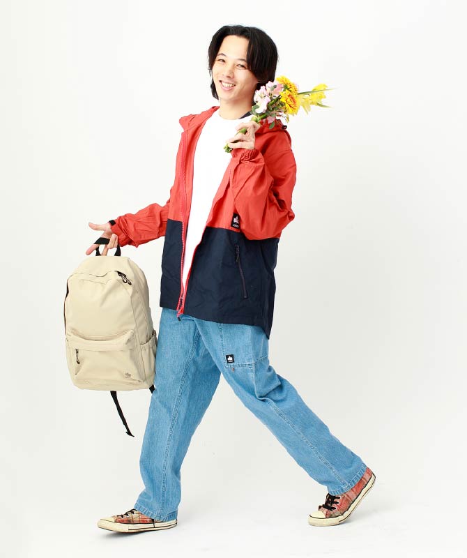 高機能なシェルジャケットを主役にした、アウトドアスタイル。デニムパンツは程よいゆとりのあるシルエットで動きやすさとトレンド感を両立。ジャケットは防汚・超撥水・防風性を兼ね備えた一着で、普段使いからアウトドアシーンまで幅広く活躍します。