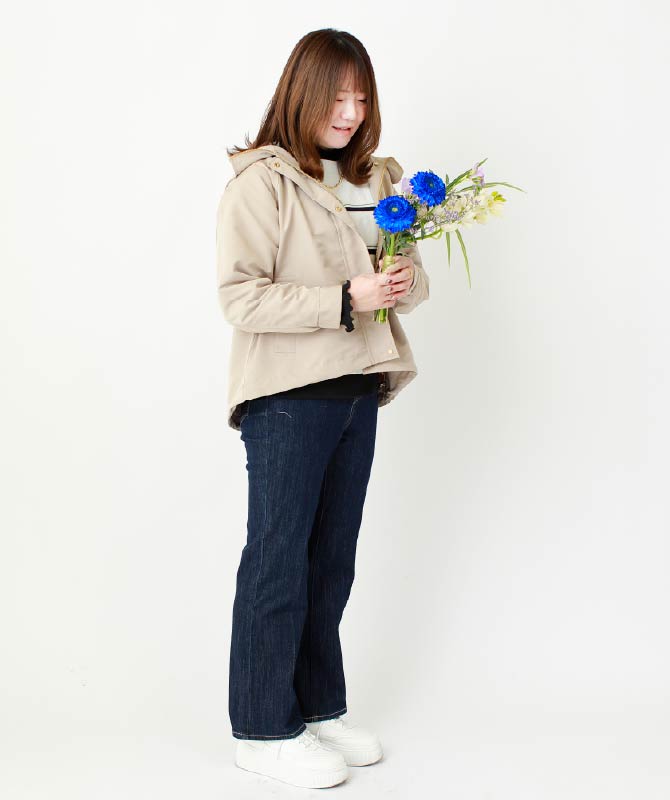 マウンテンパーカー〔撥水加工〕 9,350円、ボートネックニット 4,479円、デニムソフトフレアーパンツ 5,979円