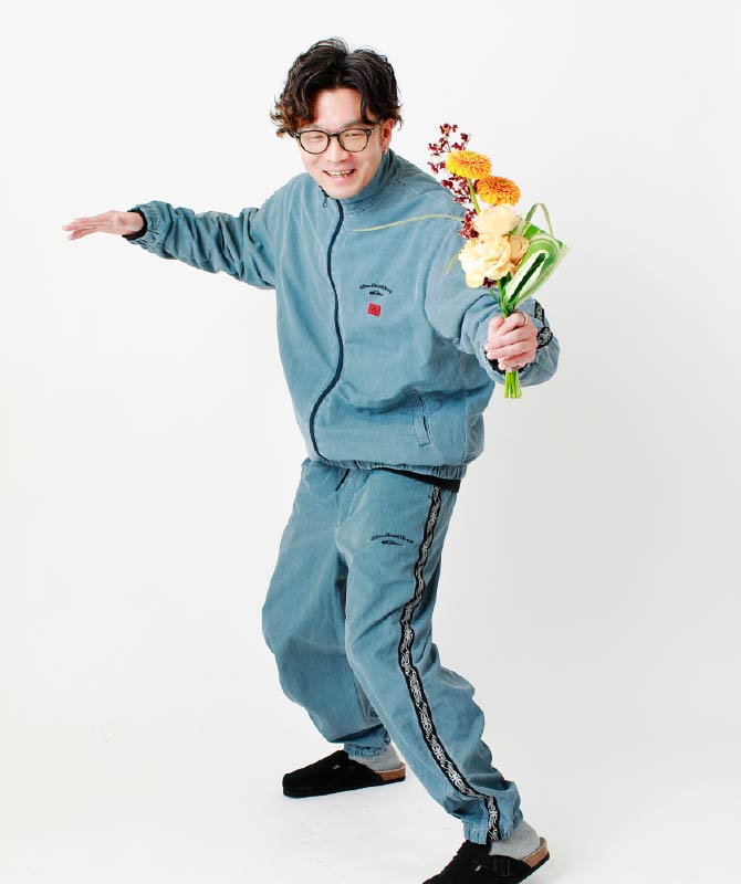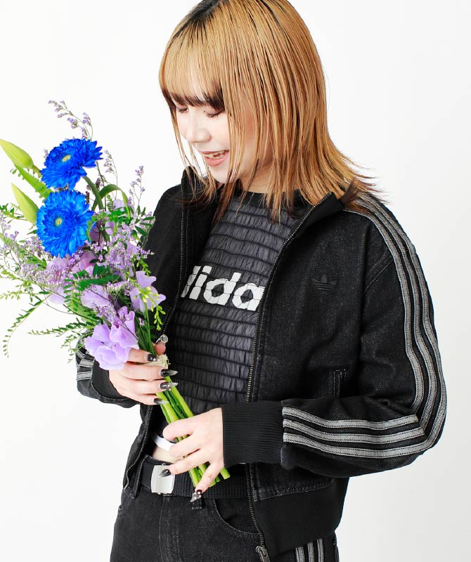 クラシックなスリーストライプスをアウターとパンツの両方に取り入れたストリートスタイル。トラックトップもデニム素材になっており、ラフ過ぎないスタイリッシュな見た目に。〈adidas〉の定番「サンバ」も好きなチャームをつければ個性溢れる足元になります。