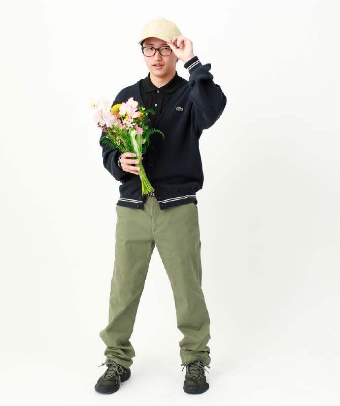 軽めの素材感と通気性の良さで人気の名品「ポロシャツ」に、リブステッチが効いたカーディガンをオン。70'sのランニングシューズをモチーフにしたスニーカーとシグネチャーキャップで程よくスポーティーな大人の春コーデです。