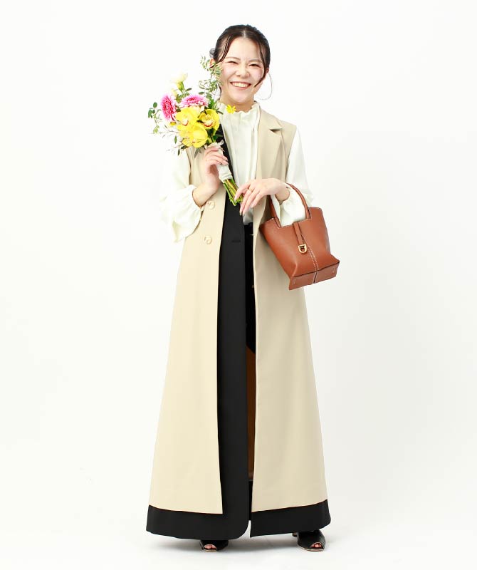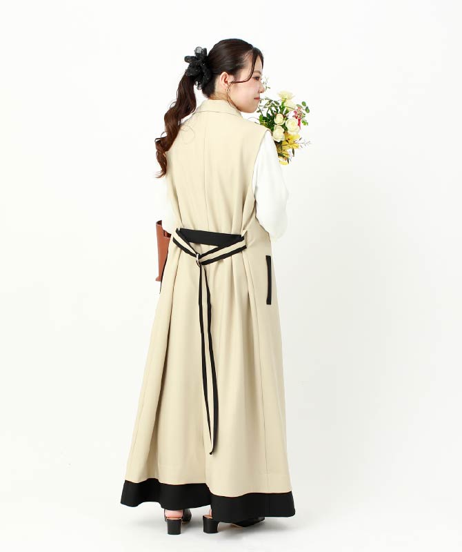 落ち着いた色味でまとめた上品なコーデ。柔らかなブラウスやテーパードパンツと合わせることで、大人感を演出します。バイカラーが印象的なジレワンピは、しなやかな落ち感のある上質な生地を使用。軽やかに揺れるロング丈が縦のラインを強調し、着るだけでスタイルアップが叶います。