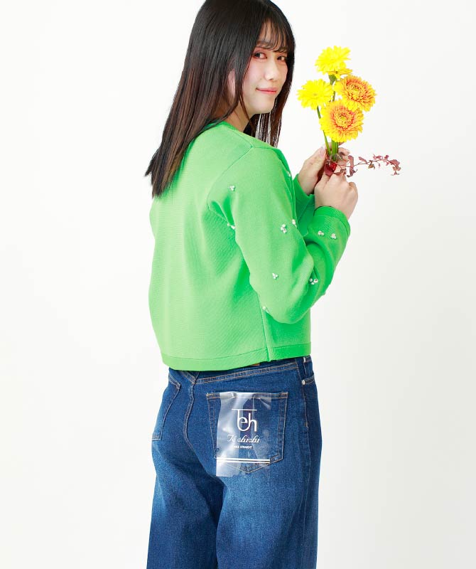 パールビジューがさりげなく輝くニットジャケットを主役に、王道すぎず、程よく個性を感じる着こなし。コンパクトなシルエットが女性らしさを引き立てます。程よい色落ちのストレートデニムが抜け感を添え、ロンTはデコルテを美しく演出。スリットミュールで足元まで洗練された印象に仕上げます。