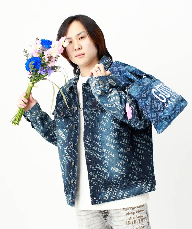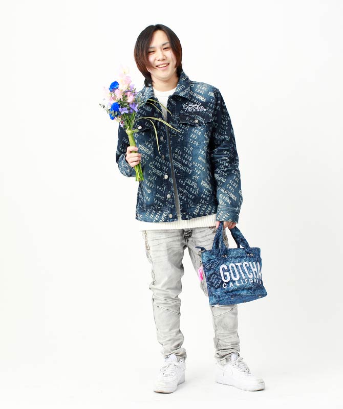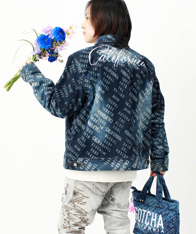 [GOTCHA] ストレッチ 総柄 デニムジャケット 15,990円、[GOTCHA] 撥水 2WAY ロゴ総柄 デニム ミニ トートバッグ 4,990円