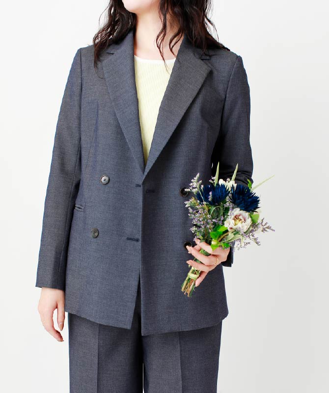ゆるすぎず堅すぎない「THE THIRD SUITS®」のダブルジャケットとワイドパンツを合わせたセットアップ。ウール混生地の上品な表情が、美しさと柔らかさを両立します。オフィスカジュアルでも単品でも着まわしが可能。ストレッチ素材とウォッシャブル仕様で快適さも備えた一着です。
