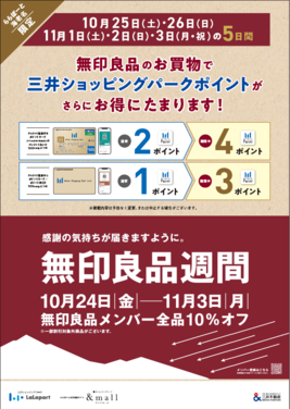 無印良品週間開催!「ららぽーと海老名限定」三井ショッピングパークポイントがさらにお得にたまります!