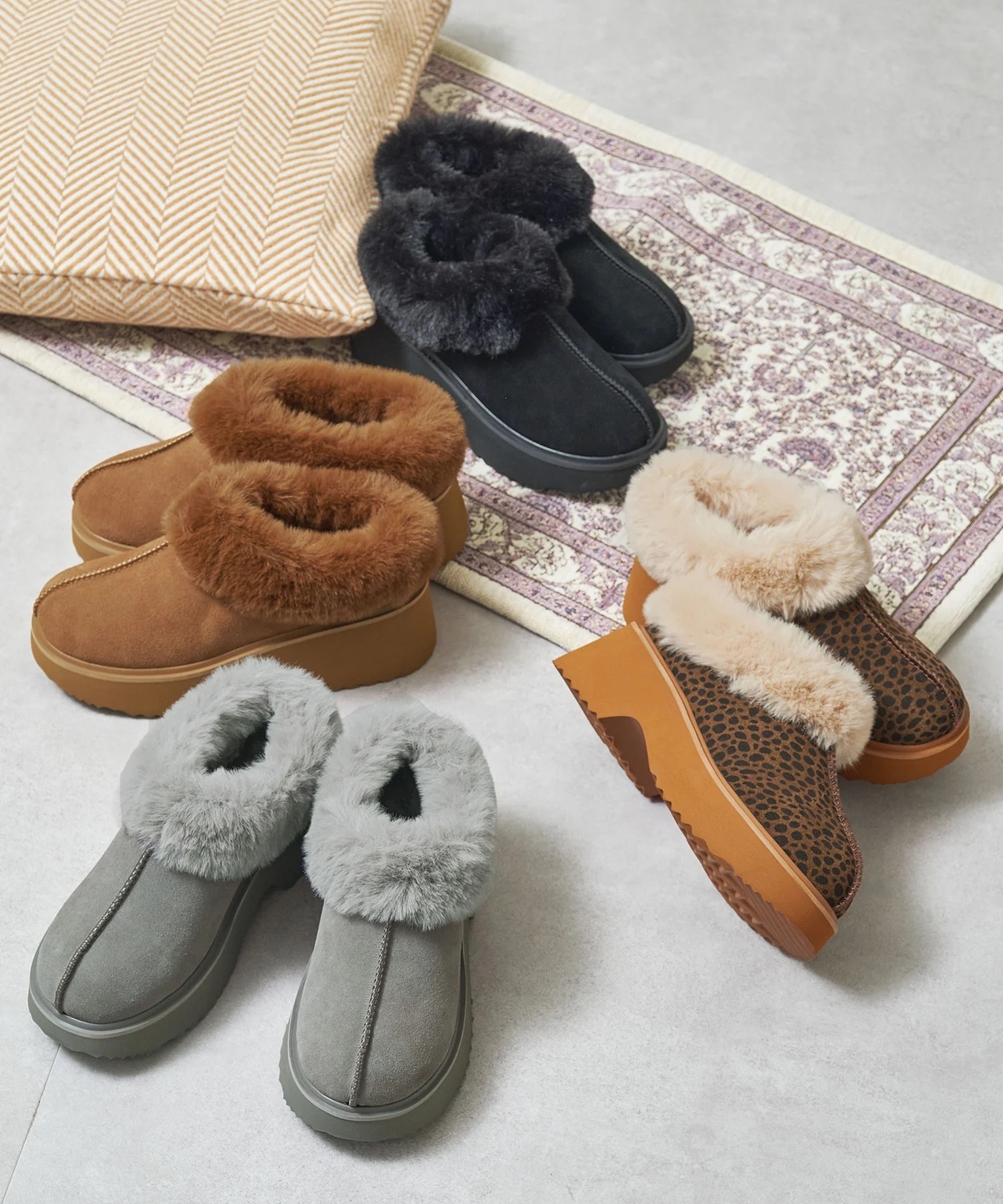 内側や中敷に暖かみのあるフェイクファーをたっぷりあしらった、ふわふわな履き心地が特徴のアイテム。