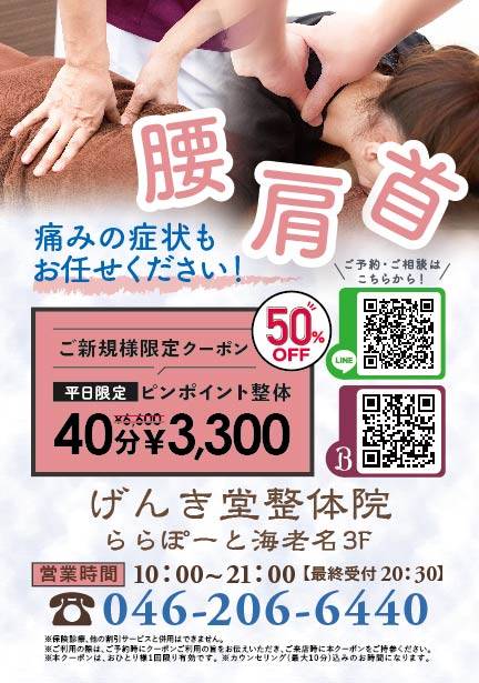 当院ではご新規様限定で整体50%OFFクーポンをご利用いただけます!