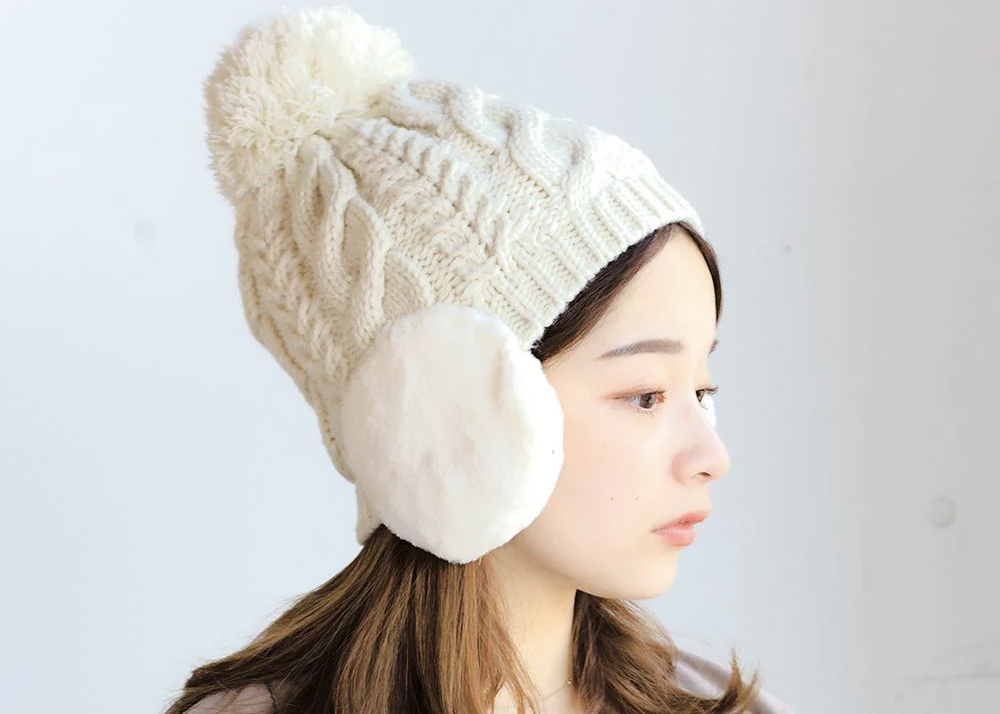 ほっこり温かいケーブル編みと、ふんわりした手触りの耳当てが可愛いニット帽です!