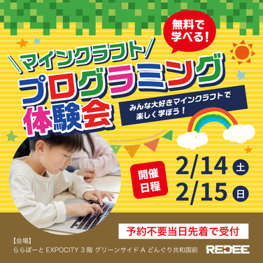【2/14(土)・2/15(日)】楽天モバイル×REDEE 大人気ゲームで学ぼう!マインクラフト体験