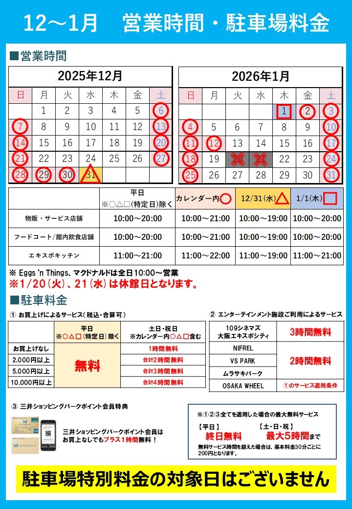 2025年12月~2026年1月の営業時間・駐車場料金について