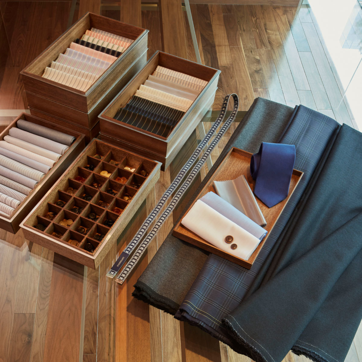 お仕立て上がりは3週間前後(シーズン、生地により異なる)、また納期短縮サービス(有料)のご利用により、通常より約1週間から10日(シーズン、生地により異なる)早くお渡しすることもできます。