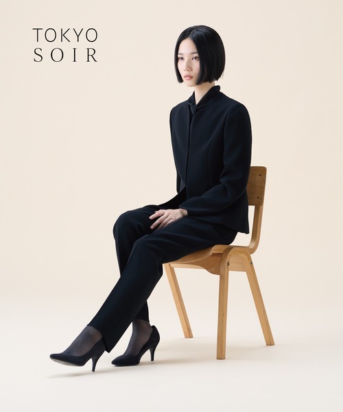 ボウタイ風ブラウスとノーカラージャケットのパンツスーツ