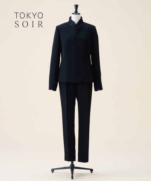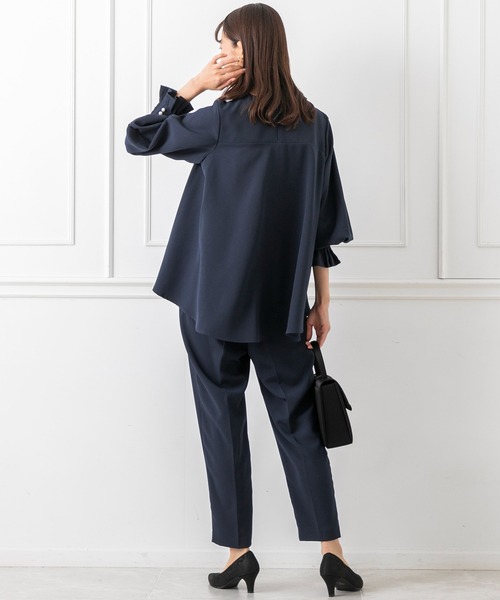 【ボウタイ風ブラウスとノーカラージャケットのパンツスーツ】